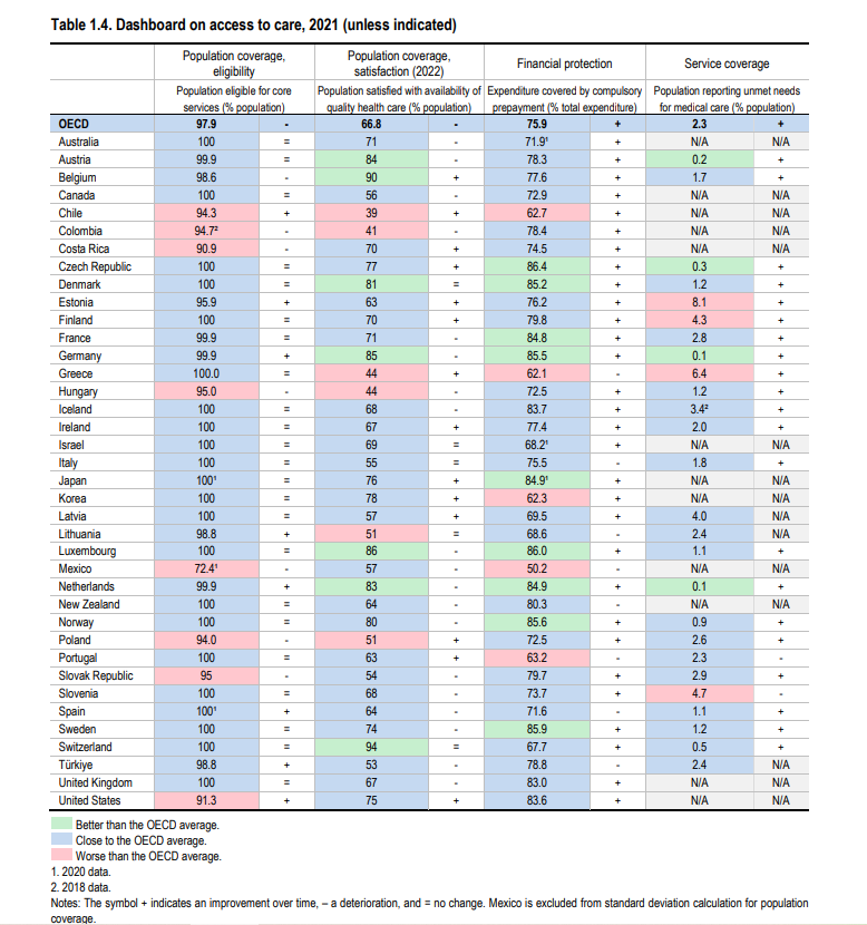 Και στους τρεις προαναφερθέντες δείκτες η χώρα μας βρίσκεται σε χειρότερη θέση από τον μέσο όρο του ΟΟΣΑ. Παρατηρώντας τον πίνακα με τα στοιχεία βλέπουμε ότι σε κατάταξη όσον αφορά την ικανοποίηση των πολιτών είμαστε η τρίτη χώρα με τη χειρότερη θέση μετά τη Χιλή και την Κολομβία.