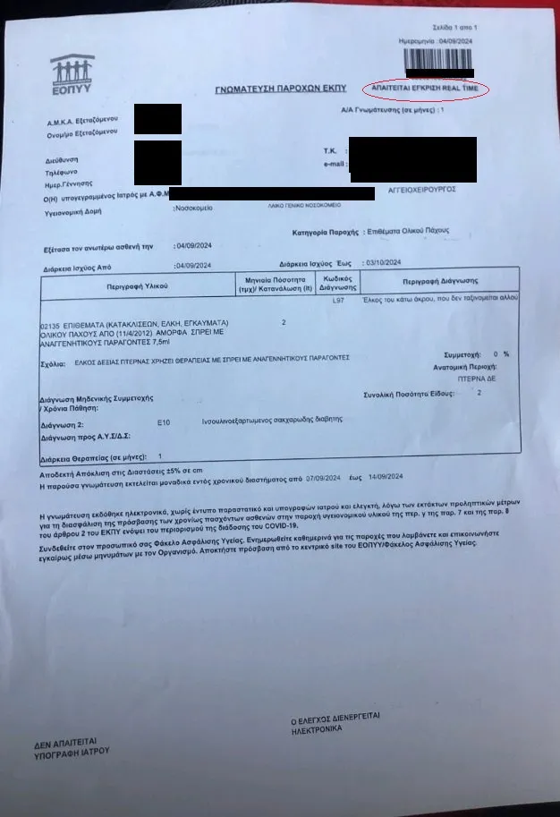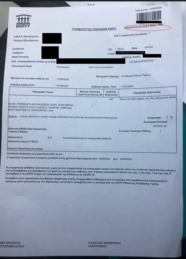 Ο ΕΟΠΥΥ το έτος 2023, δημιούργησε το σύστημα realtime, όπου αφενόςιατροί του ΕΟΠΥΥ μπορούσαν να εγκρίνουν συνταγές του εκάστοτε θεράποντα ιατρού, σε πραγματικό χρόνο, ειδικά για Ι/Π, όπως για παράδειγμα αντλίες ινσουλίνης, άμορφα επιθέματα, κ.α., αφετέρου οι ασφαλισμένοι εκτελούσαν τις συνταγές τους χωρίς εμπόδια. Από το Σεπτέμβριο του 2024, για ανεξήγητους λόγους, το σύστημα realtimeσταμάτησε να λειτουργεί, με αποτέλεσμα τα άμορφα επιθέματα και η έγκρισή τους να σταματήσουν.