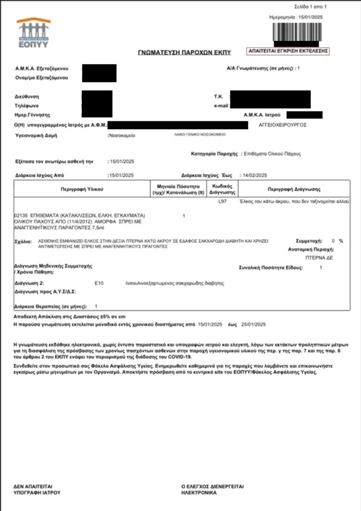 Το Φεβρουάριο του 2025, άτομο με Σακχαρώδη Διαβήτη τύπου 1, με διαβητικό έλκος στη δεξιά πτέρνα, δέχθηκε να κινηθούμε επώνυμα προς το ΑΥΣ, χρησιμοποιώντας το όνομα του, καθώς επίσης τις φωτογραφίες από την πτέρνα του και την πορεία επούλωσης του ανοικτού τραύματος, ώστε να επιτρέψει το ΑΥΣ να εκτελεστεί η τέταρτη και τελευταία συνταγή για τη λήψη του άμορφου επιθέματος, αφού το έλκος επουλώθηκε. (επισυνάπτονται φωτογραφίες).