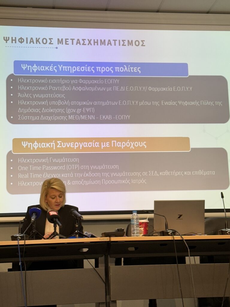 Ήδη μέσω της διαπραγμάτευσης ο ΕΟΠΠΥ έχει εξοικονομήσει 1,5 δισεκατομμύριο € για το σύστημα υγείας, ποσό που ελαφρύνει το clawback των φαρμακευτικών εταιριών. Με την χρήση κωδικού OTP κατά την συνταγογράφηση και την εκτέλεση κάθε συνταγής θα ελεγχθεί και η υπερσυνταγογράφηση ενώ θα ελέγχεται και η κοστολόγηση όλων των υπηρεσιών υγείας κατά τις νοσηλείες και τις διαγνωστικές εξετάσεις.